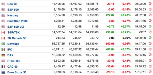 周一,美股涨跌不一,但仍处在记录高位附近,受累于油价自4月以来首次跌入40美元/桶下方,标普500指数能源股跌逾3%。投资者怀疑欧洲银行压力测试可靠性,银行股领跌欧股。新兴市场资产价格涨至一年来最高位。