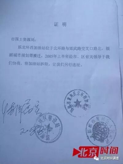 张连锋向“北京时间”(btime007)出具的相关材料显示,2002年12月,邯郸市规划局向该市成品油市场管理办公室出具的“关于北环西加油站用地的情况说明”,证明张连锋的加油站是被无偿拆除。